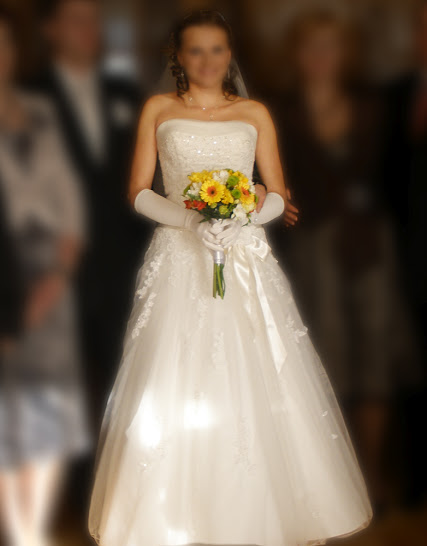 Suknia ślubna w fasonie księżniczki. Model Mon Cherie Jolie. Sukienka jednoczęściowa, gorset ozdobiony koronką, dół tiulowy. Na spódnicy koronkowe aplikacje, identyczne jak na gorsecie. W talii pas związany w kokardkę i ozdobiony kwiatuszkiem.