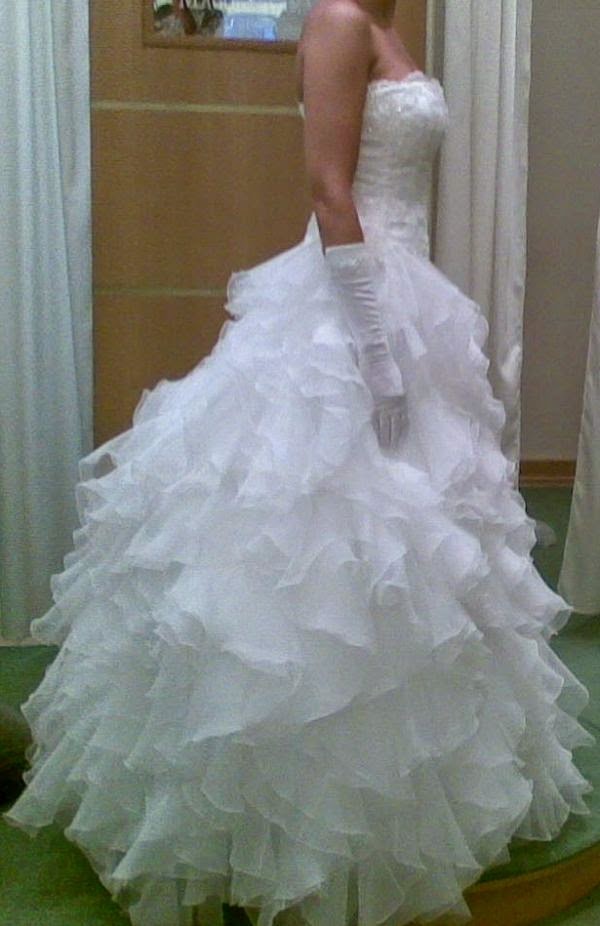 Suknia ślubna z prosty dekoltem, dół falbany.