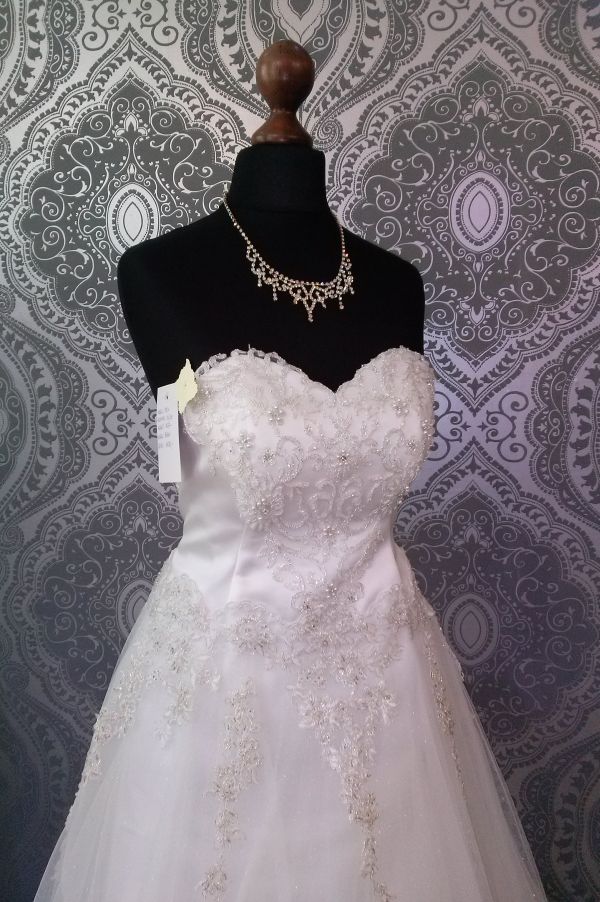 Suknia ślubna o kroju litery "A" z koronkowym gorsetem. Dekolt w kształcie serca. Kolor biel. W talii pasek z aplikacja. Dół sukni z tiulu. Rozmiar 38.